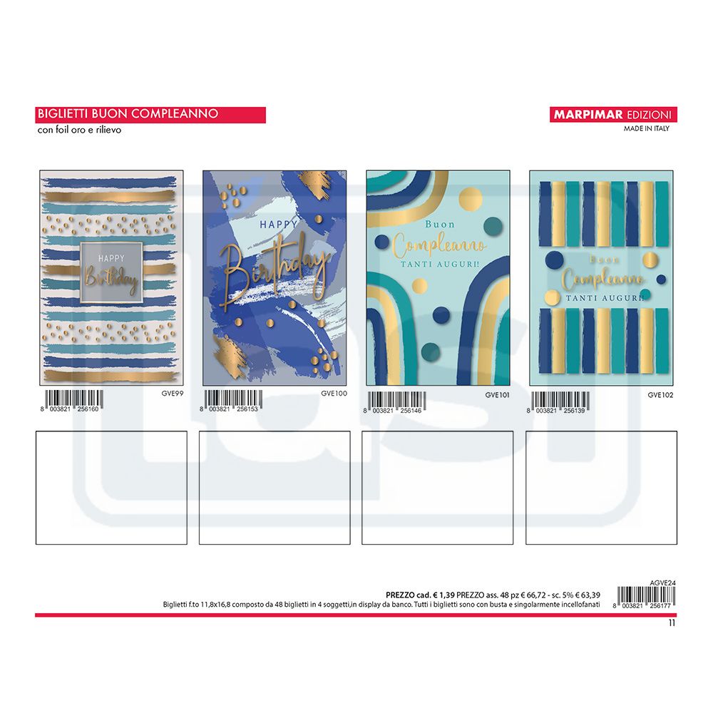 BIGLIETTI COMPLEANNO FOIL ORO + RILIEVO x 12 Pz. ART.AGVE24